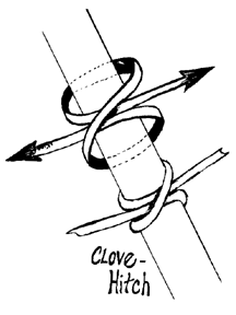 You've just collected a bunch of willow stems for basket making and you want to use one of the sticks to tie the bundle together. After neatening the bunch, pick a long stem (I prefer to use one with a gall or other defect) and insert the thick end through the middle of the bundle so that it sticks out the other side. Wrap the thin end around, passing next to the protruding end. The next time around, bend the protruding end over and wrap into the bundle. Finish by tying a clove hitch around half or less of the willow twigs, or, wrap around some of the twigs and push the bent side of the wrapper over one and under the next of the wraps (Figure 2). If the bundle is tapered, finish by pushing the binding towards the thicker end to tighten. A couple of things are at work here: a lot of wrapping creates a lot of friction; and by starting through the middle of the bundle, the binding can't rotate back and become loose. This same principle applies when wrapping any roundish object. When possible, both start and finish either through the center, or by tying off to a crossing piece (in lashing).