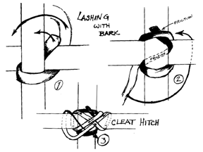 You are building a shelter, and are lashing poles together with bark strips. If you were using cordage, you would start with a timber hitch, wrap twice around in a square, over under pattern, then frap (wrap at right angles to first wraps, tightening them). The end would be secured with a clove hitch. Bark doesn't want to do much of this. Begin by doubling the end of the bark strip over one of the poles. Leave enough overlap so that the double section (with the short end under) crosses over the second pole. Being flat, there should be enough friction to hold. The second round of wrapping should cross over the first so as to increase the pressure on the double section. Finish with a cleat hitch over both ends of one of the poles (Figure 3). Frapping is not very affective on stiff bark, so if the lashing is not tight enough, using a wedge between the poles can tighten it. A wedge can be used to retighten any binding that has become loose due to shrinkage of the wood as it dries.