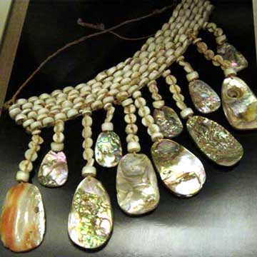 California indigenous necklace made of Washington clam shell beads and red abalone pendants.