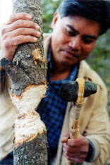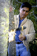 Chopping down a California Bay Laurel (Umbellularia californica) for bow staves.