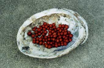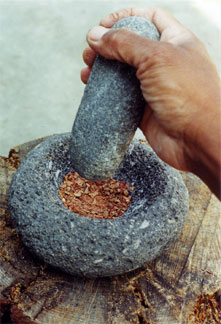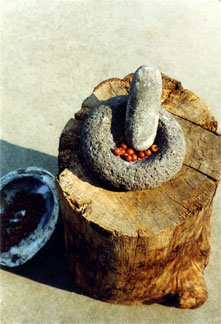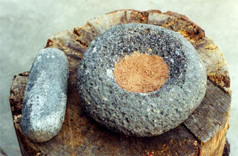 Preparing manzanita berries in a basalt mortar to make manzanita cider.