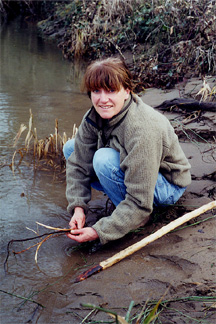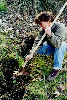 Gathering sedge rhizomes with a digging stick. The rhizomes were then washed at the water's edge.