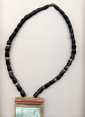 Fishing license holder attached to a pine nut / Washington clam shell bead necklace.