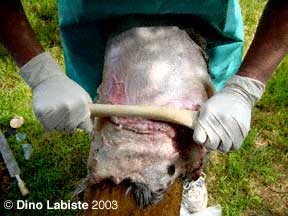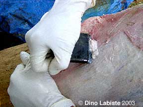 Fleshing a pelt with stone and bone tools.
