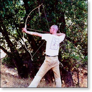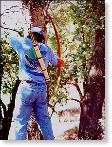 Dino shooting his osage orange bow and wearing a bamboo quiver.