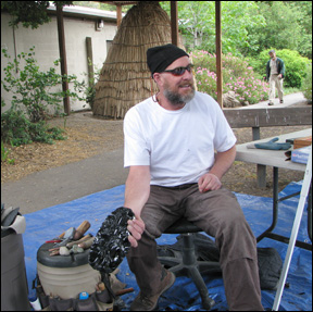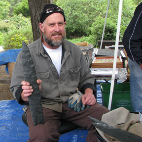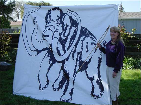 Susan Labiste and her atlatl/mammoth target for school programs.
