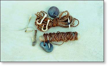 Fishing gear: dogbane fishing line (2-ply cordage), bone (cow) gorges & hooks,