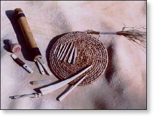 Bone (cow) tools, a river cane needle case with a wooden plug, and the beginning of a sweetgrass coiled basket.