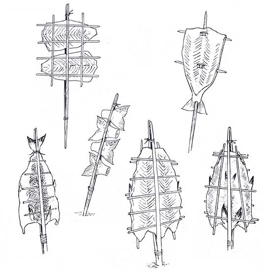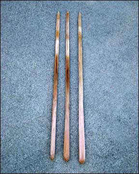 All you need are wooden stakes made out of cedar or redwood. I have also used branches made out of willow. You can probably use any wood that is not toxic or will not impart an unpleasant taste to your food. Still, I prefer the smell of cedar wood. The cedar stakes are sharpened on one end and thicker at the bottom. The stake has a flat area in which to keep the salmon meat from rotating and sliding on the wood. My cedar stakes are 24 inches long.