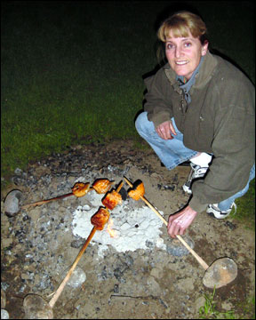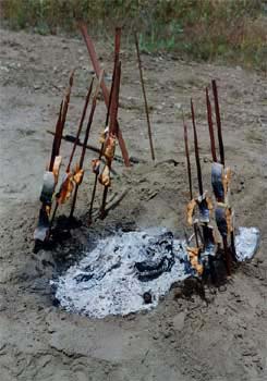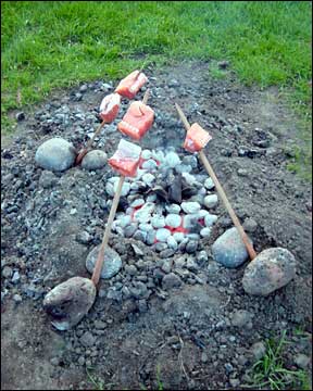 After you have skewered your salmon, push the bottom end of your cedar stake into the ground. I carved a point on the thick bottom portion of my stakes to make it easier to push the wood into the dirt. Place a small rock under and near the bottom end of the stake. Lean the cedar stake toward the hot coals. Position a larger rock over the lower portion of the stake to keep it from popping out of the ground (see the photo below). The salmon meat should be facing toward the coals so that it will cook first. The skin will hold the fish together and keep the meat from falling apart during the cooking process.