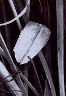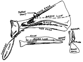 The final step in this Level II effort (see Callahan in the Primitive Technology Newsletter, Summer '95) was to find the most efficient way to make the tool with the kit available to our ancient craftsmen. The tasks to be performed included: removal of unwanted bone; smoothing of modified surfaces;and filing notches in the cutting edge. The tool kit that was known from the digs included many unmodified flakes of chert and quartzite, and various pieces of fine hard sandstone, much of it fire broken. There were relatively few specialized tools. The specific steps involved removing a fin-like ridge from one surface of the bone, and a triangular shaped section of the main piece (see illustrations). Initially I worked at removing these sections by scoring or engraving lines at the desired break points using burin-like edges on the unmodified chert flakes. This was tedious work, and did not always guarantee that the bone would break as planned. Attempting to make a saw as quickly as possible, I abandoned the engraving step and went to crude bashing with hammer stones. After breaking a few in half, I found that I could use a carefully selected anvil stone, and break the bone a safe distance from the final shape, then grind and 'nibble' it to shape. This took much less time and effort, and produced a replica that compared favorably to the originals. If the bone is fresh and soft, engraving in a few problem spots can help avoid disasters. Once shaped, all rough surfaces were smoothed on a sandstone abrader.
