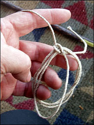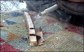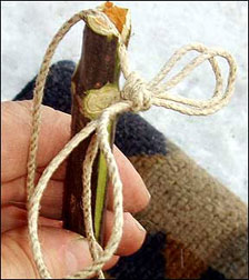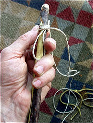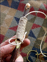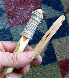 You can see in my pictures the green elderberry being scarfed to a short, dry piece of alder. It can be easily removed when it gets too short and another piece with a similar scarf put into the socket. I cut the scarfs with my pocket knife, but you could use a stone flake or grind the scarfs with a coarse flat rock. I like using thumb loops on a hand drill.The loops are a bowline on a coil. Loops let you use a shorter drill, plus it's just easier to use a hand drill. I make the thumb loops long, then tie a marlin spike hitch (truckers hitch) to shorten to the right length. I then put it into a notch at the top of the green spindle. Also, notice I'm using my shoes to spin the drill. The toes pointing towards me, while spinning the drill on the balls of the soles.
