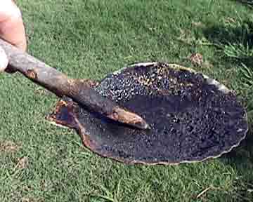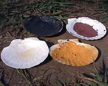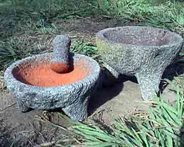 The lava stone is ideal for several reasons. First, the microscopic air bubbles that make the stone porous, creates an self sharpening grinding surface. As the pestle slowly pulverizes the inside of the bowl, it is constantly exposing the new sharp edges of the bubbles below. I have used my molcajete to grind mineral pigments, charcoal for pitch and well as grains and seeds. These bubbles of air are also a great heat insulator which makes it ideal as a small brazier. The molcajete can be full of red hot glowing charcoal and it's legs will still be cool to the touch. I have used these in classes where they have been placed on picnic tables and easily moved when required. At gatherings where there isn't a central fire to get a shovel full of coals, commercial, self starting briquettes can be used. I have used the molcajete as a heat source for straightening arrow shafts, heating and melting pitch and keeping hide glue hot when painting with pigments. Molcajetes can be purchased at most stores that sell Mexican food supplies and at some Mexican import shops. They range in price from $10.00 to $18.00 and can also be found on the internet. They all come with a pestle made form the same lava stone.