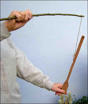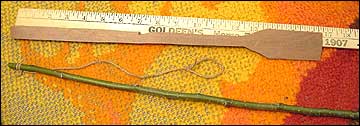 My introduction to the shingle dart came from my Dad when I was eight-years-old. He acquired an old cedar shingle, whittled it into the shape of a weather vane and cut a notch exactly at the balance point. Then he cut a willow switch about two feet (60 cm) long, tied a foot (30 cm) of string on the end of the switch and put a loop in the end of the string. I spent untold hours using the switch and string to fling the dart very high into the air. I think this was a popular pastime of the late nineteenth century for young boys. It is described in D.C. Beard's "The American Boys Handy Book," first published in 1882, as a "Whip-Bow." Many years ago I read, in a book on the Indians of the Great Plains, an account of the "traveling arrow" which was almost exactly the same. It used to lob arrows into a pond full of ducks. I also saw the late George Stewart demonstrate a similar weapon at the Rabbitstick Rendezvous several years ago. This makes a great project for children who are just learning how to use a knife.
