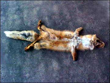 Here is a tanned fox pelt using the typical cased skinning method. The front feet are left off by cutting around the ankles. The rear feet are also cut around the ankles. Then a cut is made up the rear leg and across to the other ankle. The pelt is peeled from the carcass like a pullover sweater.