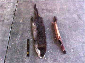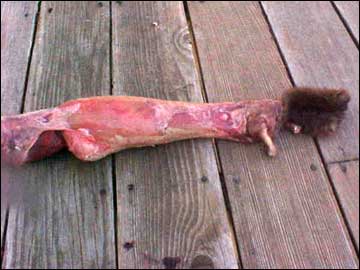 Now to skin out the tail. The bone can be removed from off the tail, leaving the rest of the tail intact. The boneless tail is then a cone with a lot of hair on the outside. So much hair that it cannot be turned inside out without splitting the tail This is one part of Jean's story I couldn't figure out. In all fairness, Jean describes the medicine bag as cured and not brain tanned. To cure a pelt, a taxidermist would pour some preservative chemicals, such as salt and borax, down the tail and leave it intact. However the result is a very stiff tail. A stiff tail is fine for a taxidermy mount, but not so fine for a bag.