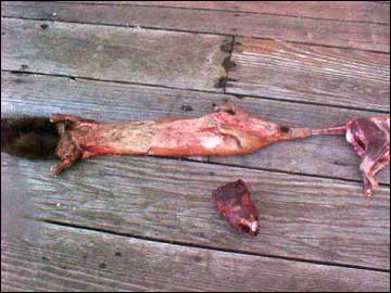 Since this pelt is going to be brain tanned, the flesh side is turned inside out. A brain tanner has to work right on the flesh side of the skin, to scrape, brain, soften and smoke it. So, this is where I departed from the throat cut only theory and split the tail open. If the contents of the bag were to get into the tail, it would be difficult to get them out. I will sew the tail cone shut near the base, and leave the remainder of the tail split open. The fleshing phase was just slightly different than a case skinned pelt. As I pushed the fleshing bar from abdomen toward the tail, the lower part of the pelt would slightly inflate with air. All mustelids have some smell, although the mink smell was relatively mild.