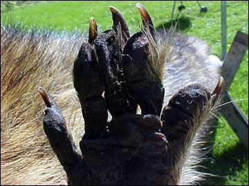 Here is a close-up of the raccoon's front paw. The paws are a bit stiff and wrinkly.