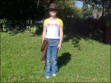 The neanderthal character of Isa is described at four and a half feet tall. This modern girl is four and a half feet tall tall, wearing the mink pelt in the same fashion as the Neanderthal medicine bag. The mink tail clears the ground by a few inches.