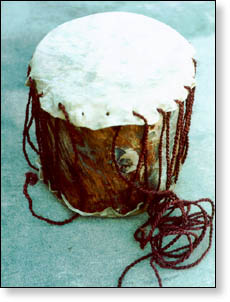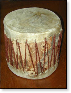 Center the bottom end of the drum body on top of its matching membrane and place the other membrane on top of the top rim of the drum. Align the holes of both membranes. Lace the rawhide drumhead. After lacing all the holes, the cordage is then pulled tight and tied.