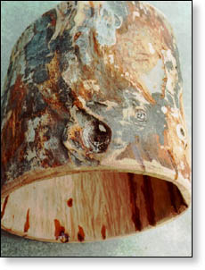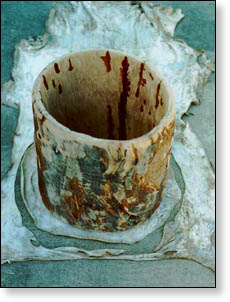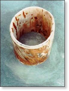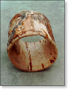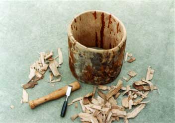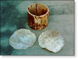 The top and bottom rim were ground smooth by abrading the stump against a flat, concrete pavement. The flatter the rim, the tighter the fit of the hide. Also slightly beveling the outer edges of the top and bottom rim will make the rawhide drumhead fit tightly.