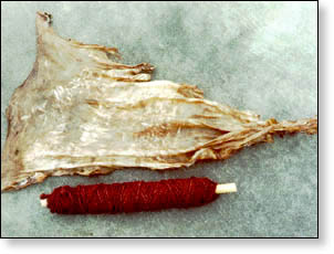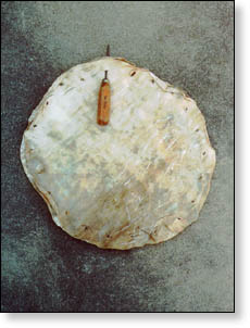 Place the two membranes back to back and punch through both of the hides simultaneously. The holes were punched with an awl around the edge of the membranes at 2 inch intervals and 1 inch from the edge.