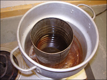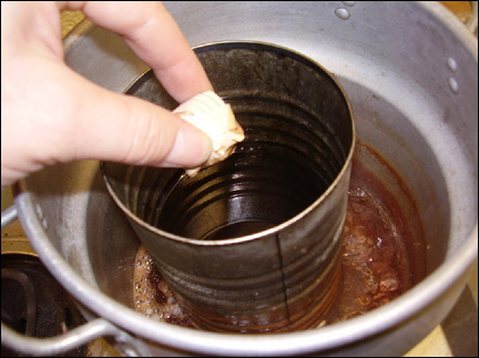Carefully dip half of the wrapped bundle into the wax to seal the bark in place.