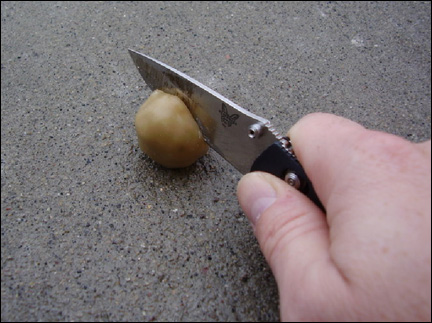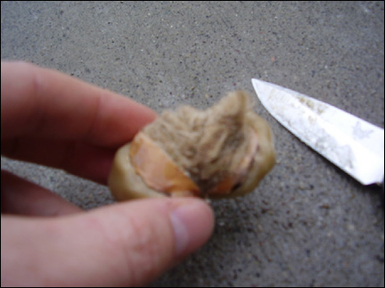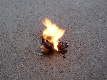 When you are ready to use your fire starter (this was done on a rainy day, on cold wet pavement, in late October, in Northeast Wisconsin), simply cut it in half, pull out the tinder nest from the inside, expose the char cloth and you are ready to go.