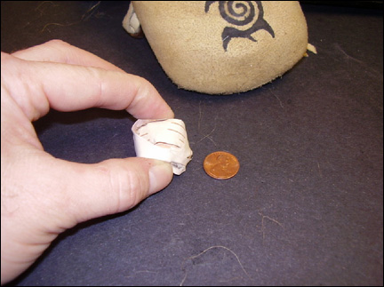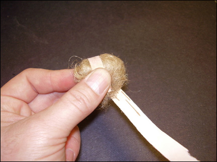 Next begin wrapping the tinder with thin strips of birch bark. When it is finished being wrapped with the birch bark, it should look like this.