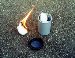 Create your own fire starting tinder with petroleum jelly, cotton balls (100% cotton), and an empty film canister. Saturate the individual cotton balls in petroleum jelly. Then store the cotton balls in the film canister. That's all there is to it. Whenever you need a reliable tinder to ignite your campfire, take out one of the cotton balls, fuzz up the edge by pulling on the loose cotton fibers, and light it with a match. The cotton ball will burn for a long time, enabling your twigs and logs to catch on fire.