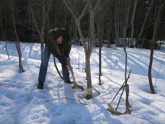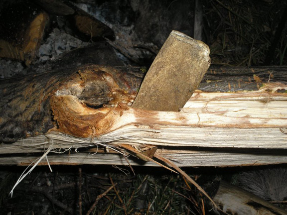 Hewing a piece of bird cherry. Notice the supporting log behind.
