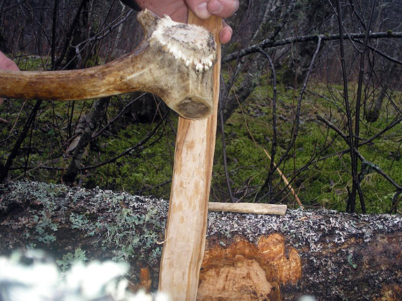 Wedges offer a means of breaking through a smooth surface and into the fibre creating a crack. In addition they function by pushing aside the fibres enlarging the crack further. For the first function you need a wedge of a hard material; stone, bone or antler. I prefer antler as the other two doesn't tolerate sideways torque as well. To save on the hard wedges, switch to wooden ones after the initial crack has been made. They don't cut as well, but if made of hard wood they will split the wood at least equally well. If it binds on a knot or the grain interlocks, use a sharp, flat antler wedge to cut through at the problem spot rather than risk breaking the entire piece by forcing it. I prefer my antler wedges to be flat, but they are impossible to make without quite large, high quality antler. Tines are a good second.