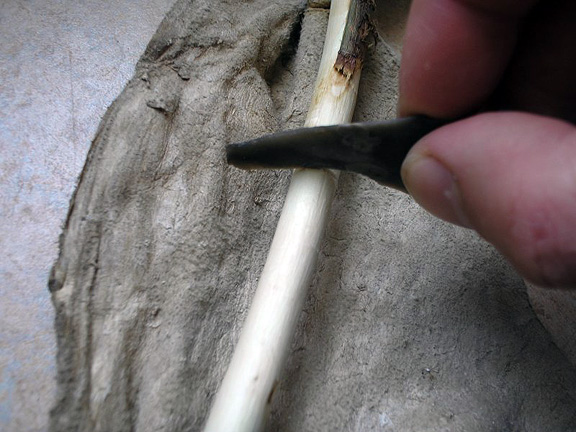 When almost through, I usually take a bone awl and gently push through the rest of the material, being careful not to split the wood. This will also enlarge the hole a little. It is quite possible to enlarge a hole made with friction by using a stone bit.