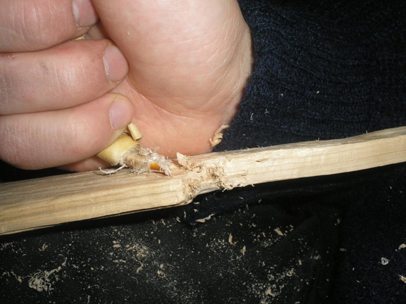 – Use materials of the shape and size you need. Searching for better materials is often better than chopping away at something which looks totally different from the final product. Naturally broken and split trees as well beaver sticks are noteworthy examples of excellent sources.