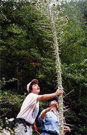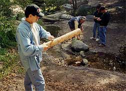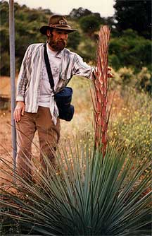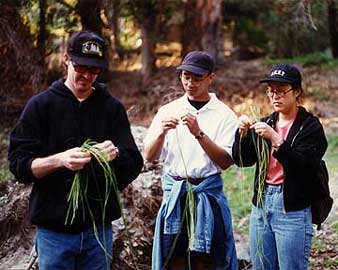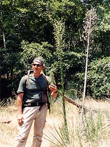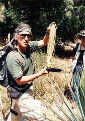One Saturday I met with a small group of students and hiked a few miles along a narrow trail in the Angeles Forest. Eventually, we came to a site where a cabin once sat, now all ruins, overgrown with ivy. Nearby was a thick patch of over a hundred agave plants, which have large bluish leaves over three feet long. Many of the agaves had matured, and their 25 foot tall flower stalks stood graceful watch over the patch. We found one stalk that had fallen over. It was about a foot thick at the base. The agave stalk has a hard outer rind, but the inside is soft and pithy. I advised everyone to take a little of the pith to add to their tinder boxes, since this was a nearly ideal tinder. Then, within a few minutes, we each cut off a three foot length of the stalk to use in crafting a quiver-like carrying case. (Yucca's dry stalk can be used identically, though yucca tends to be smaller.) The four of us carried our pieces of the agave stalk further upstream where we could sit in the shade and work on hollowing out the agave stalks. Everyone began the hollowing with a knife, but you can only reach so far with a sheath knife. So I showed everyone how to sharpen the end of a three-foot stick to be used for hollowing out the remainder of the stalk. Everyone finished their hollowing in about an hour and a half. Now we needed to add straps to each of the tubular quivers in order to carry it. This time we collected fresh leaves from a nearby patch of yucca plants. Yucca leaves are thin, narrow and sharp-pointed. When they send up their flower stalks, a profusion of creamy-white flowers follows. Yucca is an excellent fibre source with many other uses besides just rope. But rope was all we needed at the moment, so I instructed everyone in carefully stripping the leaves into even thinner segments, until each person had what looked liked a pile of thick threads. To reduce the leaves to just fibre, we wet the stripped leaves in the river and agitated them between our hands. A wonderful soap results from this process -- in fact, this is possibly the easiest and most-readily available year-round soap of the wilderness. Once the leaves were reduced to mostly fibre, we took our strands and braided them into ropes to use for carrying our agave quivers. The ropes were easily attached to the agave quivers. Everyone fashioned various bottoms for their agave tubes -- the easiest was done by Jimmy, who simply tied his kerchief onto the bottom using some more of the yucca fibre. Though it took us several hours to make our carrying cases using only plants from nature, it illustrated that even without a pack, you can fabricate an excellent carrying case if you know what to look for. The cord made from yucca -- or agave -- has a multitude of uses, from tying together an emergency shelter, to fire-making, to fishing.