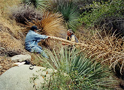 Yucca was used extensively by the Native Americans throughout the Southwest. In the course of one hour of our field trip, I demonstrated the traditional inch-thick sandal that was worn by the Chumash and Gabrielinos who once resided here. It is a simple weave that any child could master in an afternoon. Though agave leaves have a fibre which is as useful as the yucca, the juice of the fresh agave leaves can cause a rash which is equal to a poison oak rash. So when yucca is abundant, I just leave the agave alone.